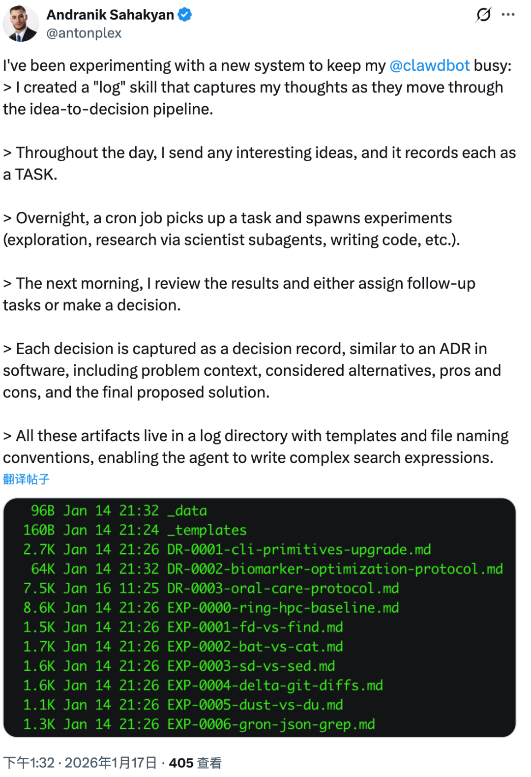而在Andranik的工作流里,灵感甚至不需要等待,他把白天的想法丢进日志,夜间智能体就会自动进行深度研究和代码验证,第二天醒来,一份包含利弊分析的完整决策报告就已经摆在桌上了。