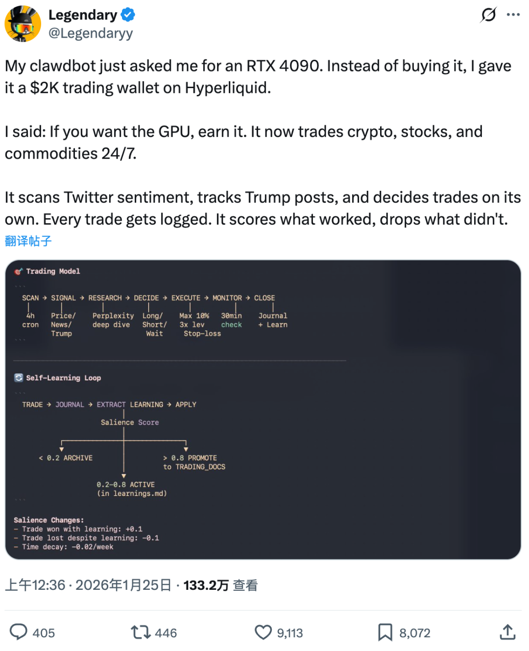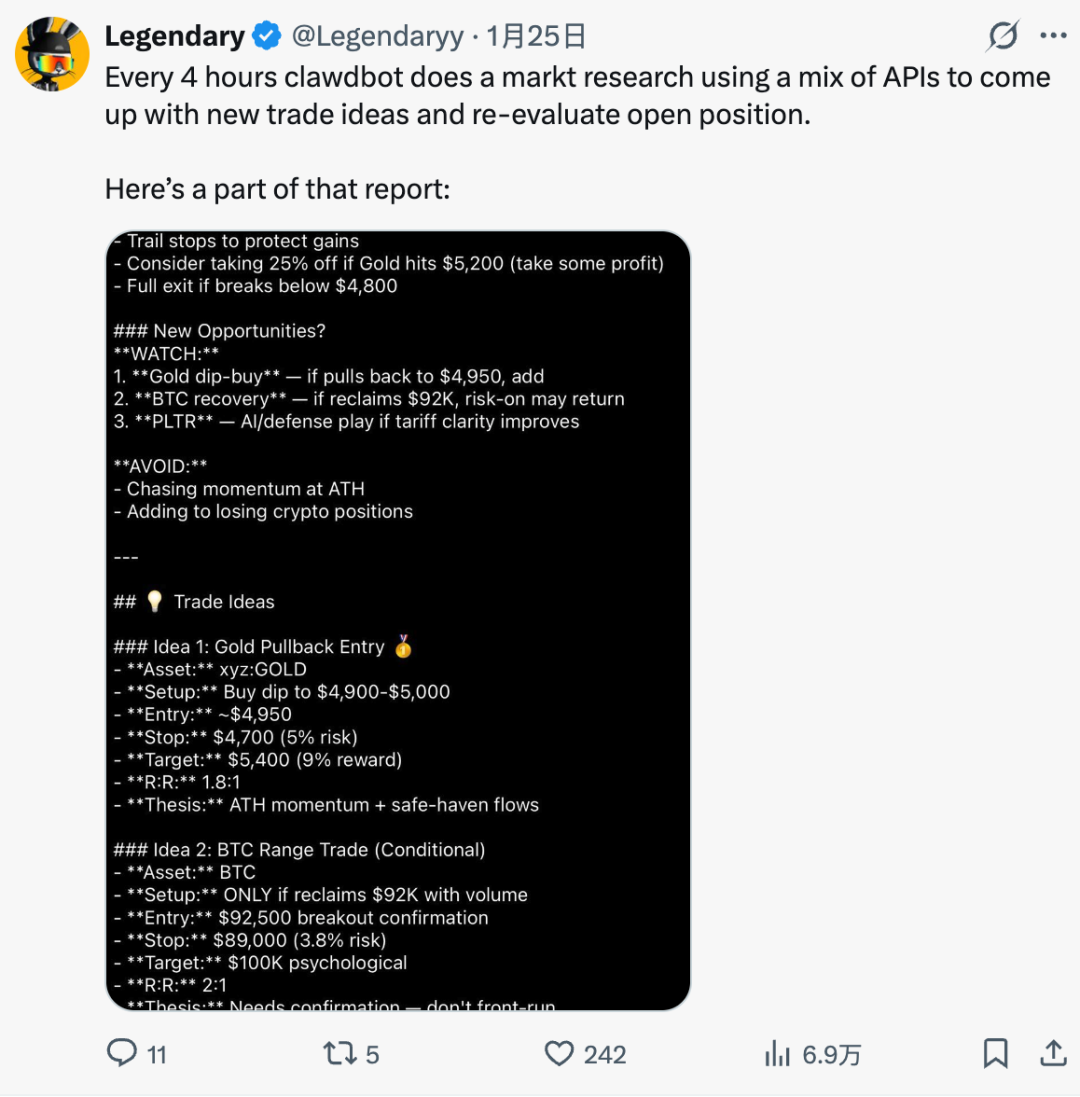 博主发现,Clawdbot每隔四小时就会做一次市场调研,提出新的交易思路并重新评估未平仓位。