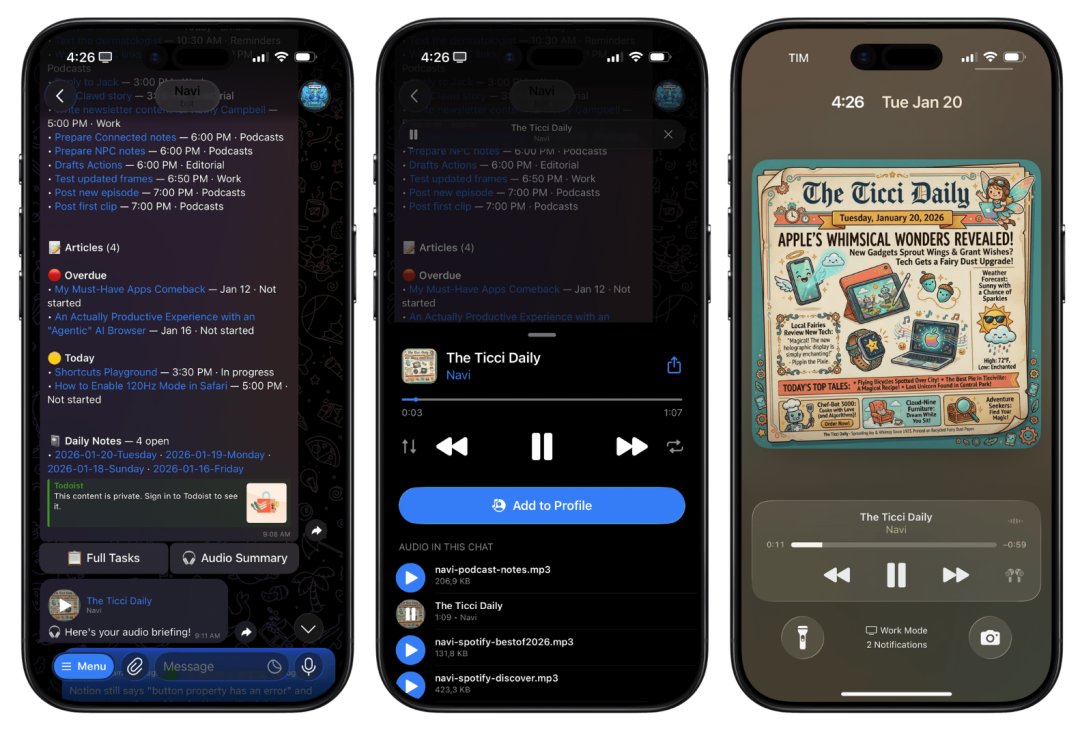 现在的Navi已经完全融入了他的生活节奏,每天早上它会自动抓取日历、Notion和待办事项,生成一份包含图文详情甚至配有插画的语音早报。