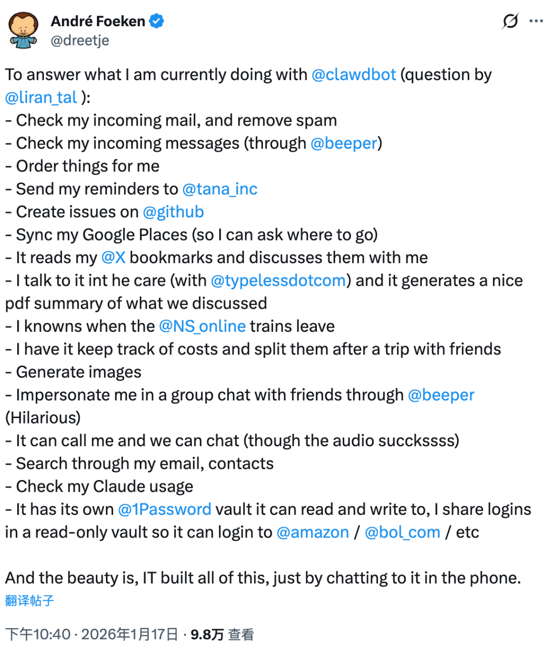 在工作流自动化方面,他甚至用Clawdbot替代了原本依赖云端服务Zapier的复杂流程。