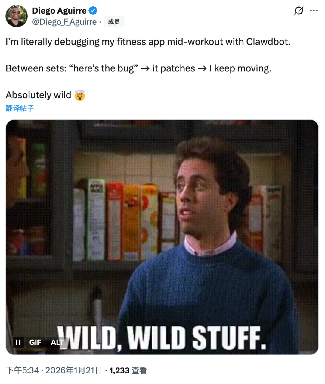 Diego则展示了硬核的“移动办公”,他在健身房撸铁的间隙发现了程序里的Bug,利用组间休息给Clawdb发个消息,等做完下一组动作,后台的代码修补就已经完成了。