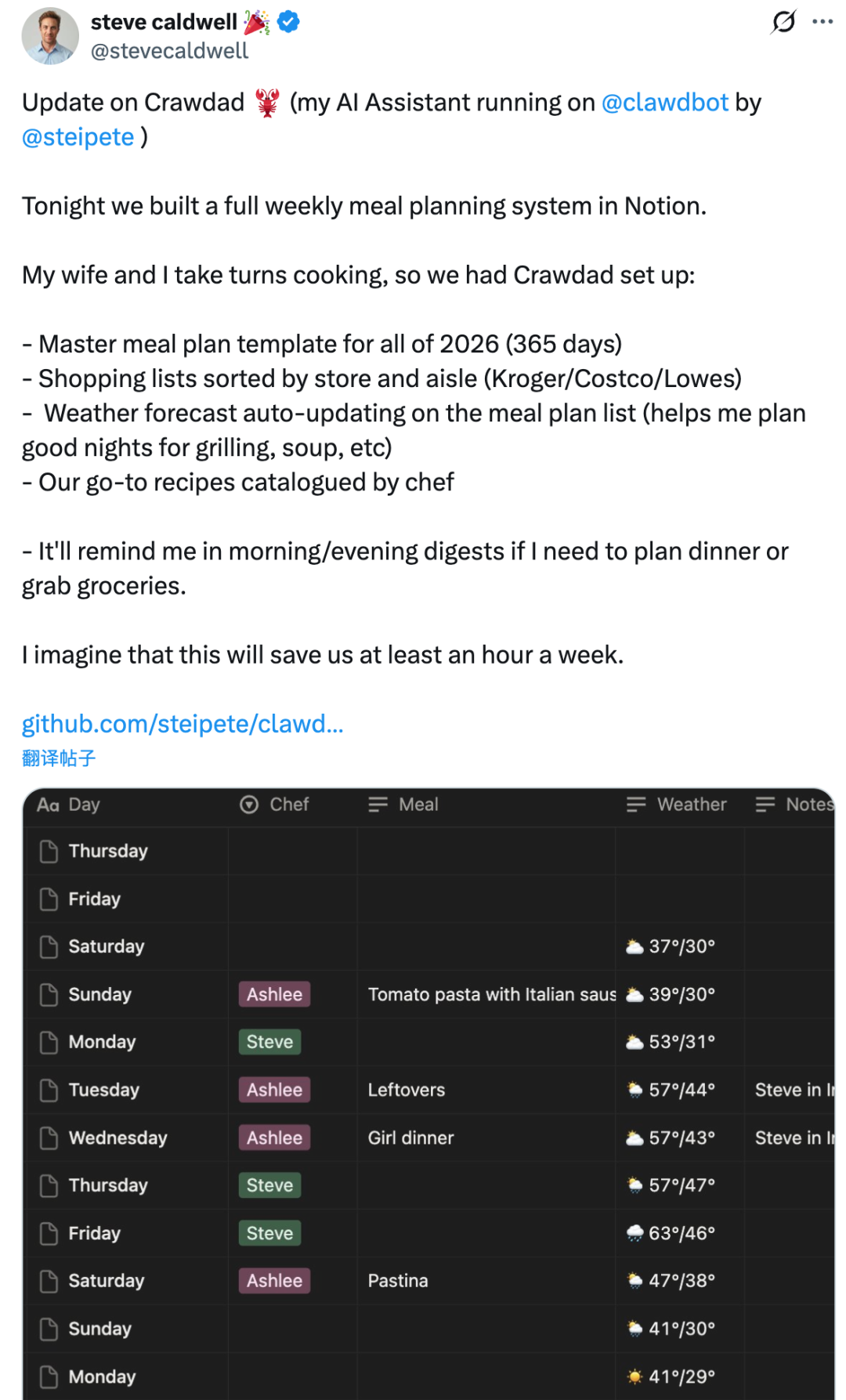 生活琐事也被安排得明明白白,Steve构建了一套“看天吃饭”的膳食系统,根据天气预报自动规划全年的菜单——晴天安排烧烤,雨天推荐热汤,甚至把购物清单按超市货架分好了类。