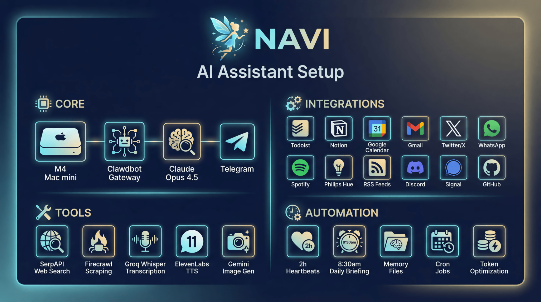 MacStories的站长Federico Viticci最近也彻底迷上了Clawdbot,他把这个运行在M4 Mac mini上的智能体取名为“Navi”,并把它调教成了一个真正懂他的数字管家。