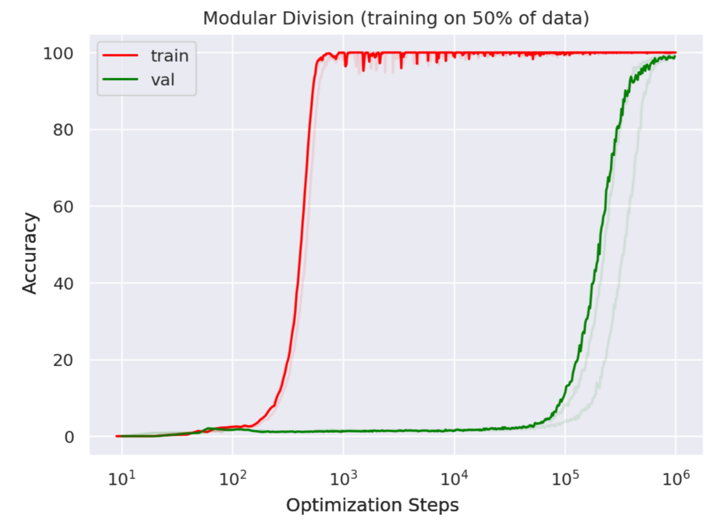 OpenAI在ICLR2021数学推理workshop中发布的论文《Grokking: Generalization beyond overfitting on small algorithmic datasets》[1],首次引入了神经网络中的顿悟(grokking)概念。而顿悟现象的发现其实源于一个有趣的巧合:当 OpenAI 团队开始探索神经网络如何进行数学运算时,他们使用一个小型 Transformer来进行模加法运算((