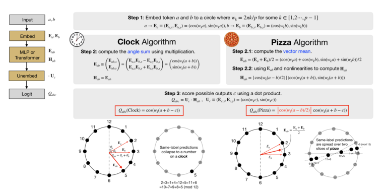 刘子鸣团队继续研究了Nanda的工作,他们展示了这些“理解”神经网络并不总是发现这个“时钟”算法,有时会找到研究人员称之为“披萨”的算法[11]。这种方法设想一个披萨被分成若干片并按顺序编号,要加两个数,想象从披萨中心指向所问数字的箭头,然后计算由前两个箭头形成的角度的角平分线。这条线穿过披萨某一片的中间:这一片的编号就是两个数的和。这些操作也可以用三角函数和代数操作来表示,即对 a 和 b 的正弦和余弦进行操作,理论上它们与时钟方法一样精确。时钟和披萨算法的原理如下图所示: