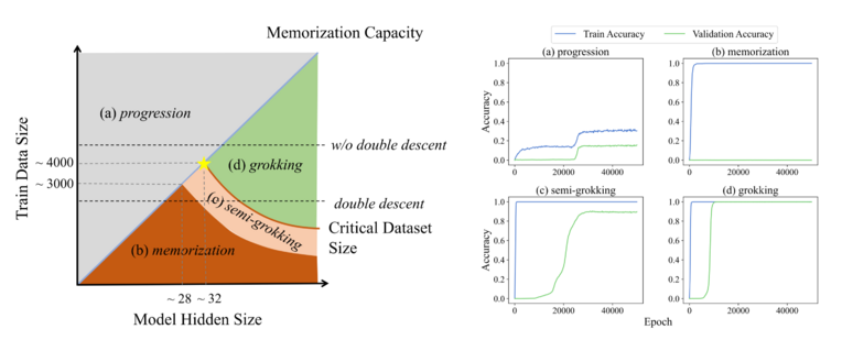 不同配置与训练数据量下模型表现出的动态差异与相图。左图展示了随着模型规模增大而提升的记忆能力与降低的临界数据集规模,可以将图像划分为四个区域——渐进区、记忆区、半顿悟区和顿悟区。每个区域对应右侧展示的特定训练动态特征,关键交点处标注了估计值。