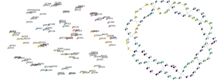 群运算和模加法运算的嵌入空间结构(左:群运算,右:模加法运算)。左图为在S5群运算上训练的网络输出层权重的t-SNE投影,可以观察到排列的聚类,每个聚类都是子群