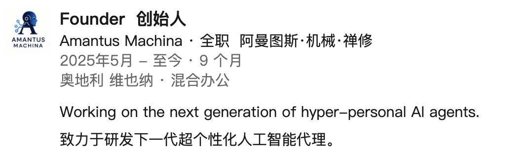 领英上,他的最新身份是Amantus Machina的创始人,致力于研发下一代超个性化AI Agent。