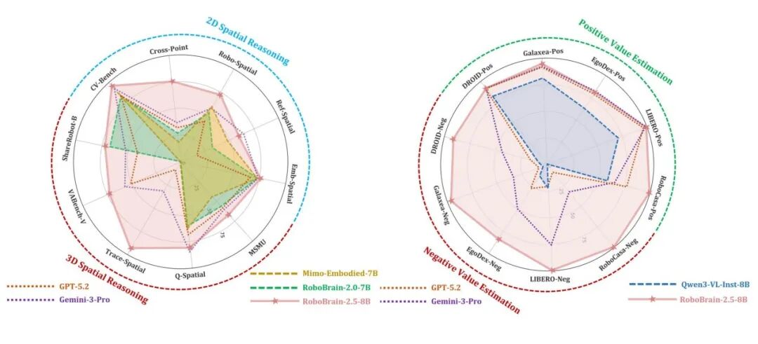 在多项空间推理与时序价值估计基准任务上,RoboBrain 2.5 取得了新的SOTA表现。这并非单点能力的提升,而是空间(可执行)与时间(可闭环)两条能力链路的同步补齐,使模型整体更接近真实机器人系统对“可控性与可靠性”的核心需求。