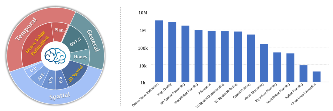 RoboBrain 2.5 的训练数据分布。左侧饼图展示了数据集的层级构成,按领域划分为时序(红色)、通用(青绿色)和空间(蓝色)。右侧柱状图以对数坐标展示各具体能力维度/任务的训练样本数量。