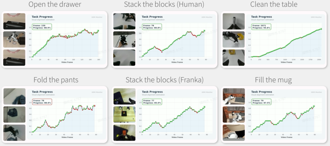 真实物理世界中的长时任务,并不缺少动作序列,而是缺乏过程级监督:当前执行到了哪一步?是在有效推进、停滞、偏离,还是已经发生失败?为此,RoboBrain 2.5 引入 Dense Temporal Value Estimation(稠密时序价值预测),基于视觉观测对任务进度进行步级别、连续评估,为下游控制与策略学习提供可随时调用的价值信号。