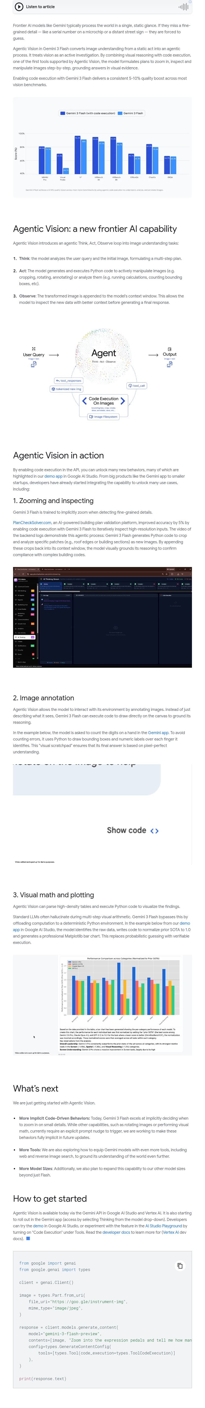 Gemini 3 Flash introduces Agentic Vision, transforming static image analysis into an active, iterative process. Unlike traditional frontier AI models that rely on a single glance—often missing fine details like microchip serial numbers or distant signs—Agentic Vision employs a “Think, Act, Observe” loop. It first analyzes the query and image to plan multi-step actions; then executes Python code to zoom, crop, enhance, or inspect regions; and finally observes results to ground answers in visual evidence. Code execution, the first supported tool, boosts vision benchmark performance by 5–10%. This agentic approach enables precise, evidence-based visual reasoning—marking a significant leap in AI’s ability to dynamically investigate and understand complex imagery.