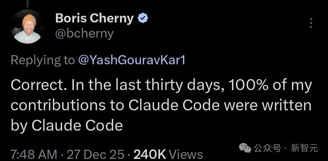 就在几天前,他在X上公开承认:过去30天,自己100%的代码都是Claude Code写的。
