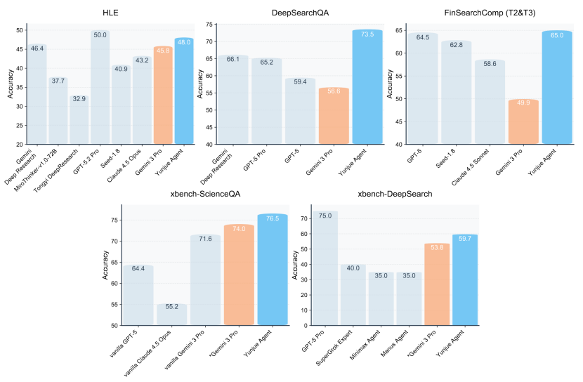 全方位碾压基于Gemini 3 Pro的Agent,在需要复杂检索与推理的任务中,甚至能高出十余个百分点。