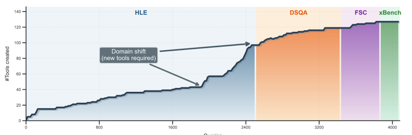 所以在积累到128个工具时,Agent才会突然发现:旧工具已经可以覆盖绝大多数新任务,没必要继续扩张。