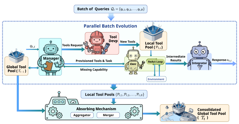 基于上述思考,团队以「工具优先」为理念,打造了一支可实现原位自进化的Agent军团。