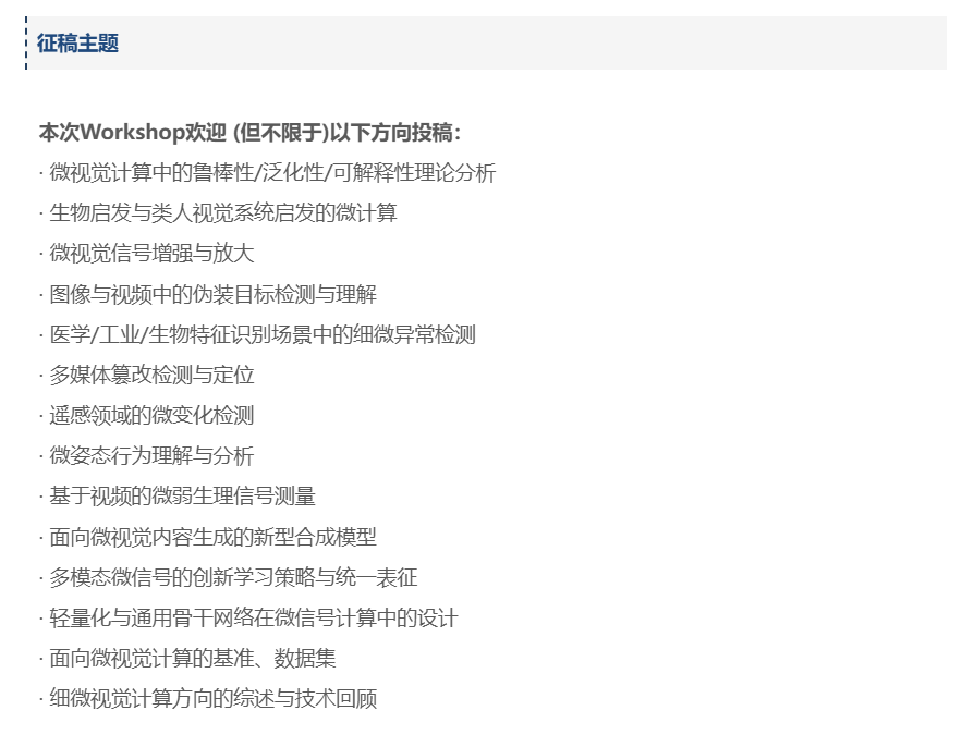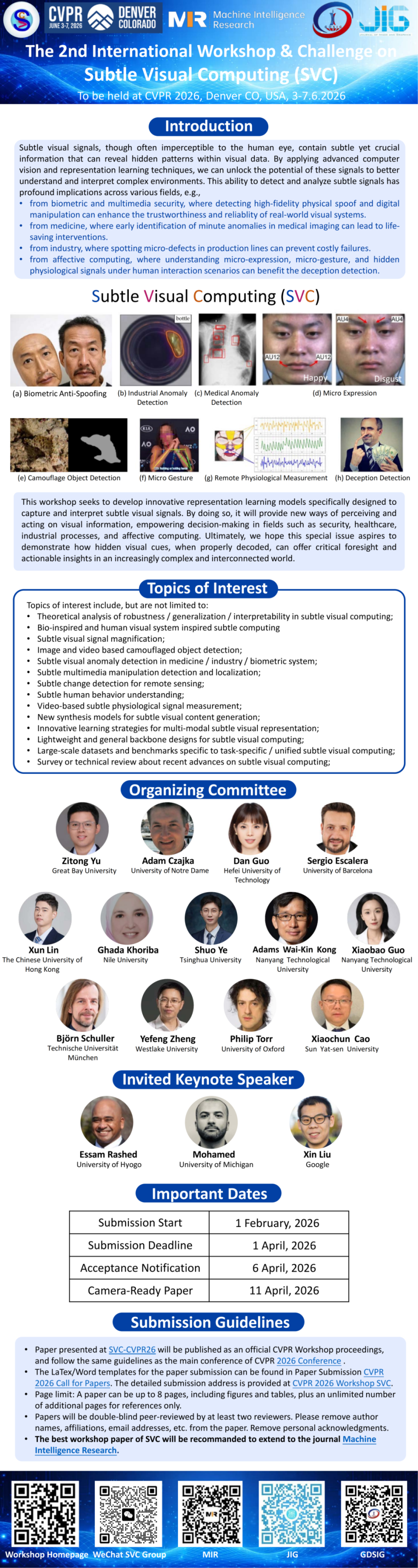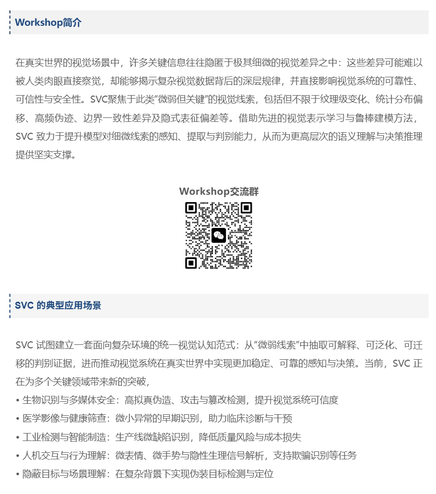 为进一步推动计算机视觉在“微视觉计算”方向的前沿研究与产业落地,The 2nd International Workshop & Challenge on Subtle Visual Computing (SVC)将于CVPR 2026期间在美国丹佛(Denver, CO, USA)举办(2026.06.03–06)。我们诚挚邀请全球学术界与工业界研究者积极投稿与参会,共同探讨“SVC”的关键问题与最新进展。