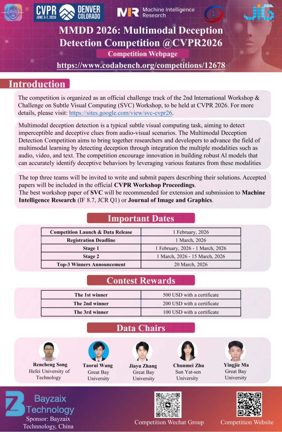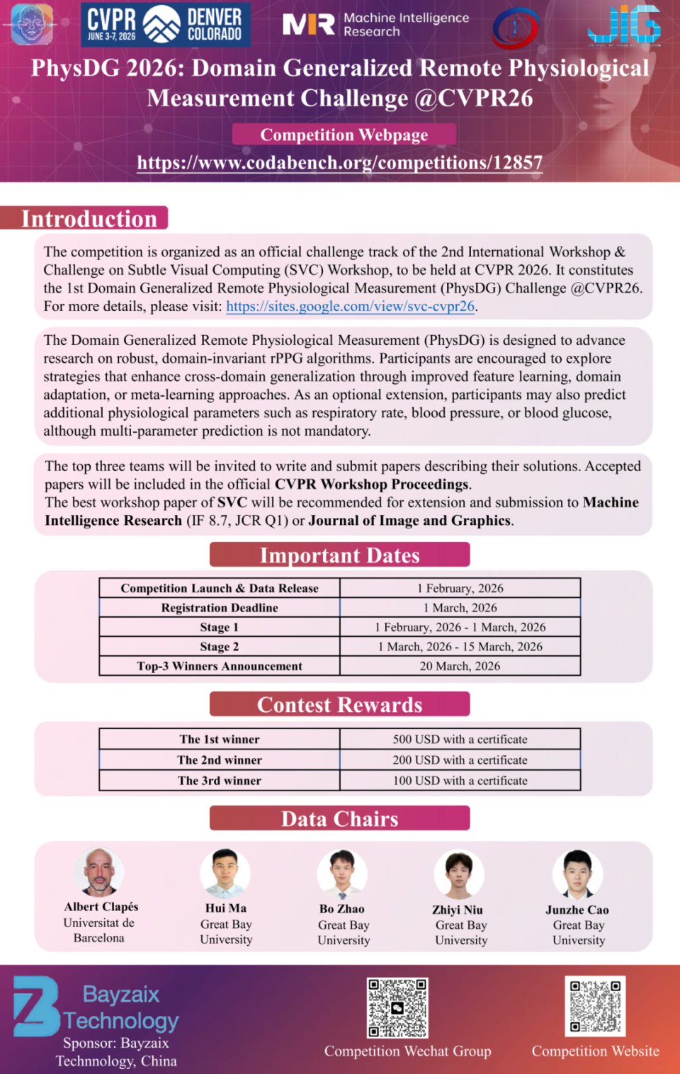 本次Workshop下设两项挑战赛,赛事前三名需将解决方案撰写为论文投稿。录用论文将收录于CVPR Workshop官方论文集,并有机会参评“最佳论文奖”。优秀论文可推荐至Machine Intelligence Research (影响因子8.7,JCR Q1) 或《中国图象图形学报》发表,进一步提升学术影响力与传播范围。