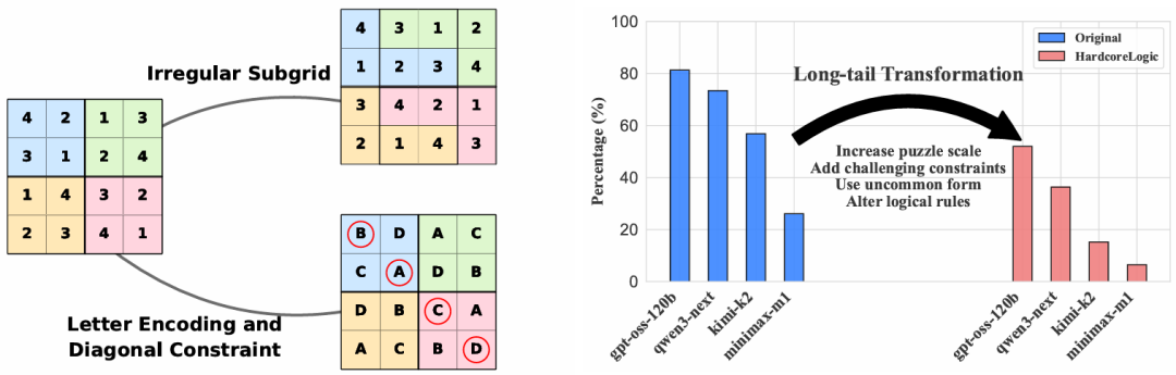 摘要:大型推理模型(Large Reasoning Model, LRM)在复杂任务中展现出卓越性能,包括需要推导出满足所有约束条件的解决方案的逻辑解谜游戏。然而,它们能否灵活地将适当规则应用于不同条件——尤其在面对非标准游戏变体时——仍是一个悬而未决的问题。现有数据集聚焦于9x9数独等流行谜题,存在过度拟合经典格式及死记解题模式的风险,这可能掩盖模型在理解新规则或适应变体策略方面的缺陷。为此我们推出HardcoreLogic——涵盖10款游戏、逾5000道谜题的挑战性基准测试,旨在检验LRMs在“长尾”逻辑游戏中的稳健性。HardcoreLogic通过三大维度系统性改造经典谜题:复杂度提升(IC)、非常规元素(UE)及不可解谜题(UP),从而降低对捷径记忆的依赖。对多个主流推理模型的评估显示,即使在现有基准测试中表现优异的模型也出现显著性能下降,表明其高度依赖记忆化的刻板模式。尽管复杂度提升是主要难点来源,模型在应对规则细微变异时同样表现吃力——这些变异未必增加谜题难度。我们对可解与不可解谜题的系统性错误分析,进一步凸显了模型真实推理能力的缺口。总体而言,HardcoreLogic揭示了当前LRM的局限性,并为提升高级逻辑推理能力建立了基准测试标准。