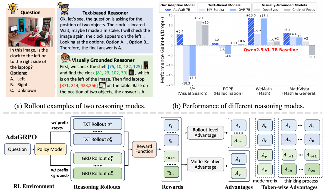 摘要:目前的视觉推理方法主要聚焦于探索特定的推理模式。虽然这些方法在特定领域能取得一定的提升,但难以培养出通用的推理能力。受此启发,我们提出了一种新颖的自适应推理范式——Mixture-of-Visual-Thoughts,简称 MoVT。该范式将不同的推理模式统一在单个模型中,并引导模型根据上下文选择最合适的模式。为了实现这一目标,我们设计了了 AdaVaR:一个两阶段的自适应视觉推理能力学习框架。首先,在有监督的冷启动阶段,模型对不同的推理模式进行统一学习;随后,通过精心设计的 AdaGRPO 算法进行强化学习,从而诱导出模型的模式选择能力。广泛的实验结果表明,AdaVaR 能够有效地引导模型学习并区分多种推理模式,并实现基于上下文的自适应模式选择。该方法在各种场景下均取得了一致性的性能提升,凸显了 MoVT 方案在构建通用视觉推理模型方面的有效性。
