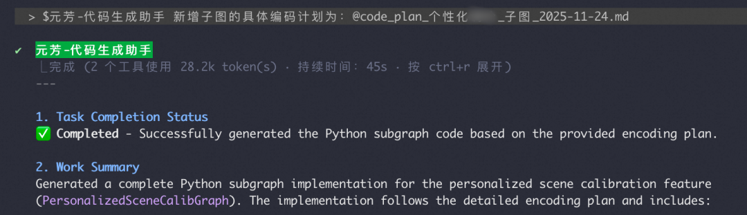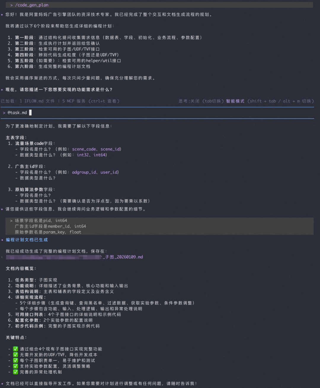产出的编码计划文档,其内容包括:详细的功能说明、输出输出表的结构、具体完整的执行步骤、可用接口列表、部分示例代码。 再基于这份编码计划,通过「代码生成Agent」生成对应的业务代码。