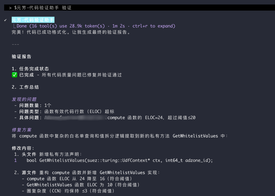 完成上述流程后,进入提交代码CR前的最后一步:代码验证环节。通过「代码验证Agent」对于不符合CommonAds代码库入库要求的代码自动进行代码拆分&优化、统一代码风格 等处理,此时代码质量基本处于可入库的状态,即可进入人工CR环节。