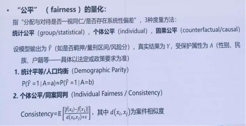 “公平”(fairness)的量化:指“分配与对待是否一视同仁/是否存在系统性偏差”,三种度量方法:统计公平,个体公平,因果公平。