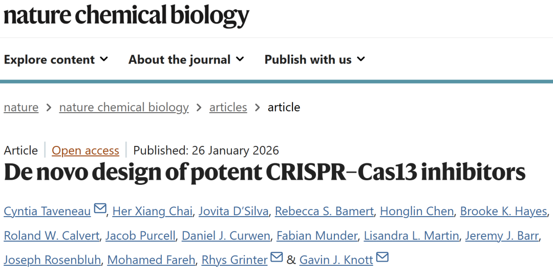 Taveneau, C., Chai, H.X., D’Silva, J. et al. De novo design of potent CRISPR–Cas13 inhibitors. Nat Chem Biol (2026).