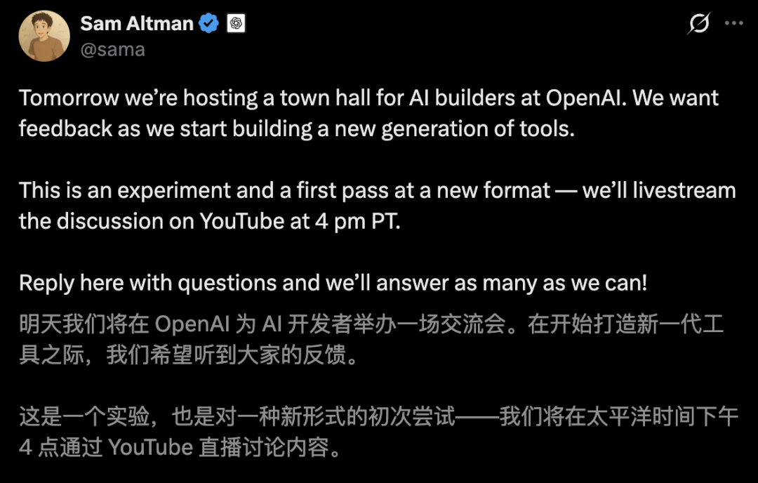 从昨天直播预热可以看出,这场QA是为了「打造下一代工具」做准备,OpenAI希望从业界反馈中迭代模型。