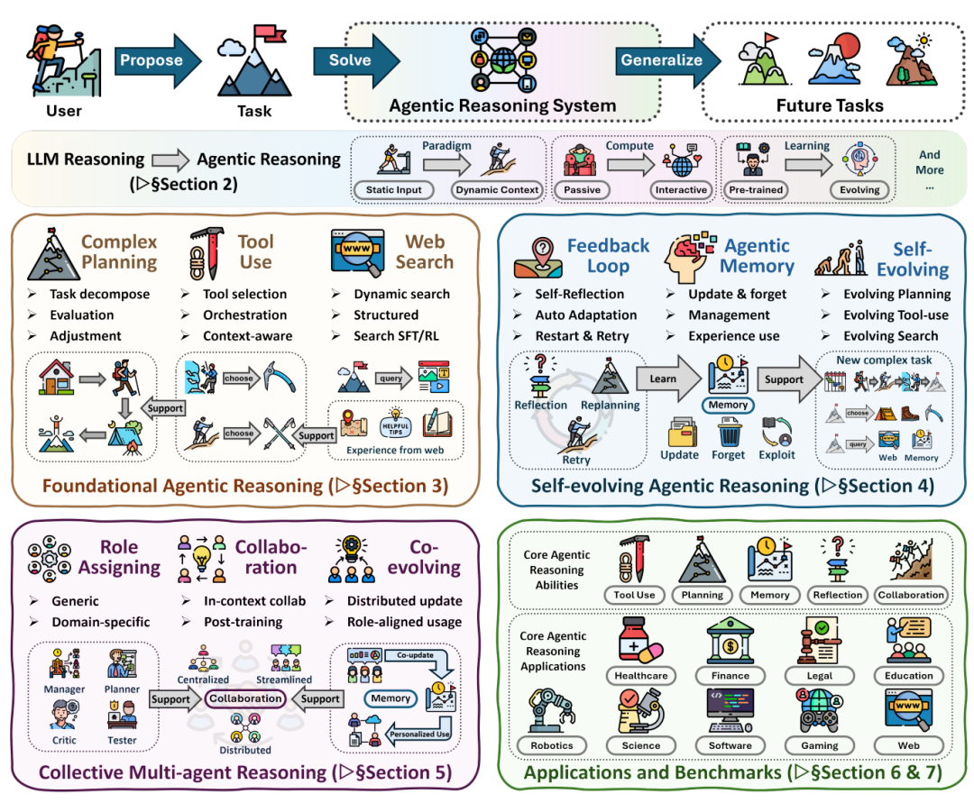 将推理视为智能体的核心机制,涵盖基础能力(规划、工具使用与搜索)、自进化适应(反馈和记忆驱动的适应)和集体协同(多智能体协作),这些能力可以通过上下文编排或后训练优化来实现。