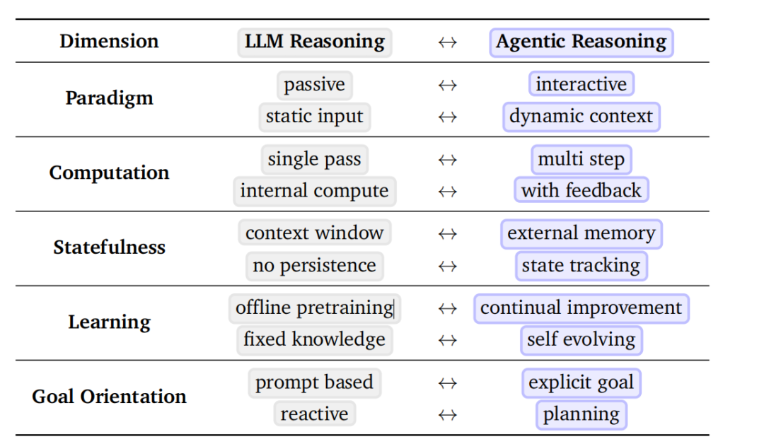 与传统 LLM 的静态问答模式不同,Agentic 推理强调模型与环境的持续交互。传统 LLM 的推理过程通常是一次性的,使用者输入问题,它基于静态的训练数据生成一个文本答案,整个过程缺乏与外界环境的真正互动。这种模式在封闭、结构化的任务中表现出色,但既无法执行行动验证想法,也无法在交互中自我改进。
