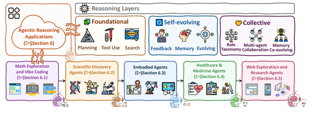 该综述长达 135 页,涉及“基础 Agentic 推理”、“自进化 Agentic 推理”和“集体多智能体推理”等不同层级,上下文推理与后训练推理两种关键优化模式,以及 Agentic 推理在科学、机器人、医疗、自动化科研与数学等真实场景中的应用,未来的开放性挑战与研究方向,等等。