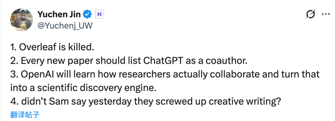 Hyperbolic Labs的联创兼CTO Yuchen Jin犀利评价,Prism已经杀死了overleaf(一种LaTeX编辑器),未来的每篇新论文都应该把ChatGPT列为共同作者。