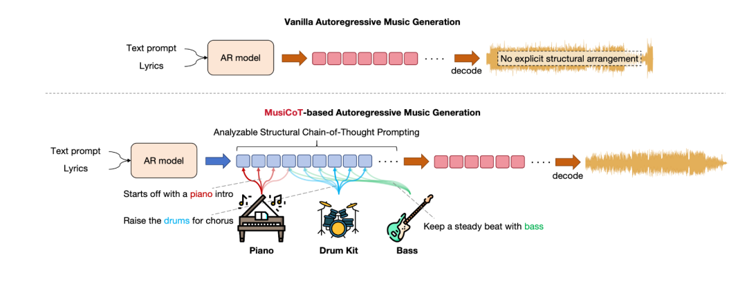 传统自回归音乐生成模型:文本/歌词→直接生成→音乐片段; 基于MusiCoT的模型:文本/歌词→思维链规划(结构、配器、情绪)→按结构生成→一首完整的歌。
