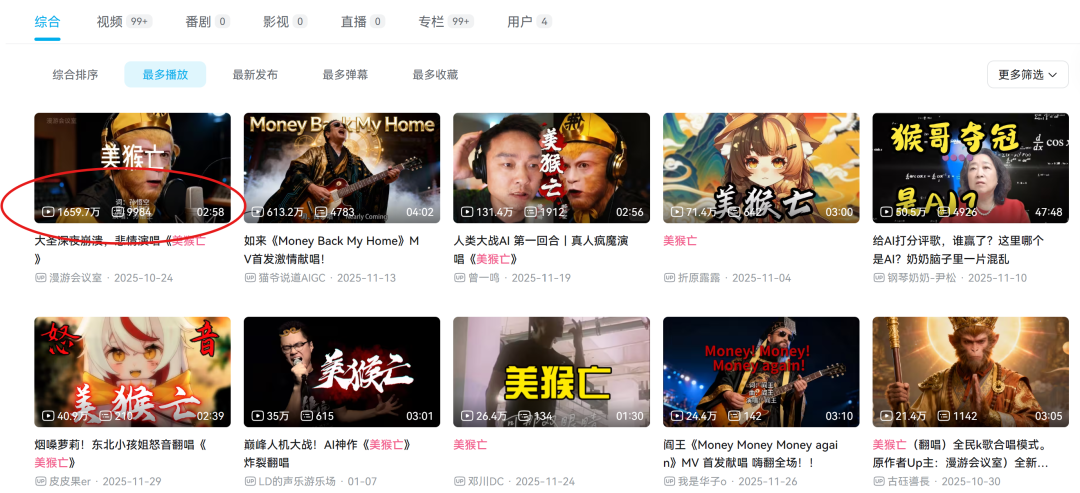 甚至还能拿来玩梗,承担起社交职责(doge)——去年B站一首AI创作的《美猴亡》就一度爆火,最高播放量上千万并引发广泛社媒讨论。