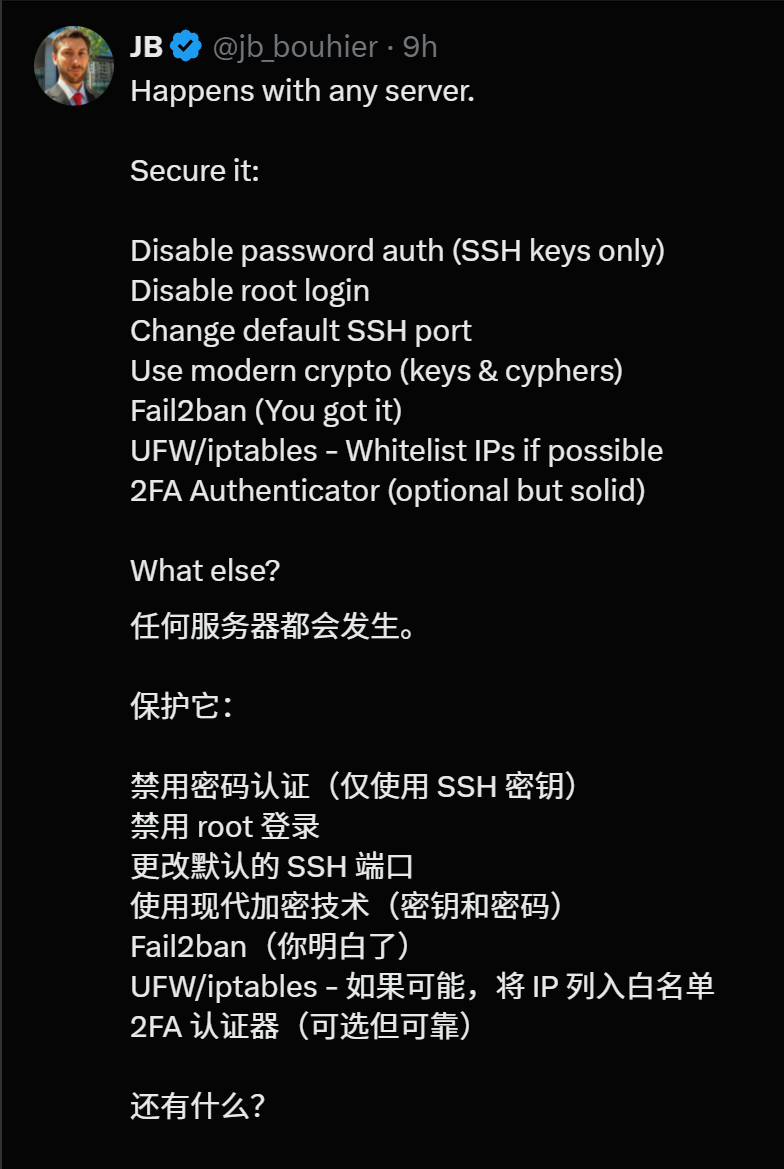 最终,这个用户通过安装fail2ban、启用防火墙和手动屏蔽IP,解决了这个问题
