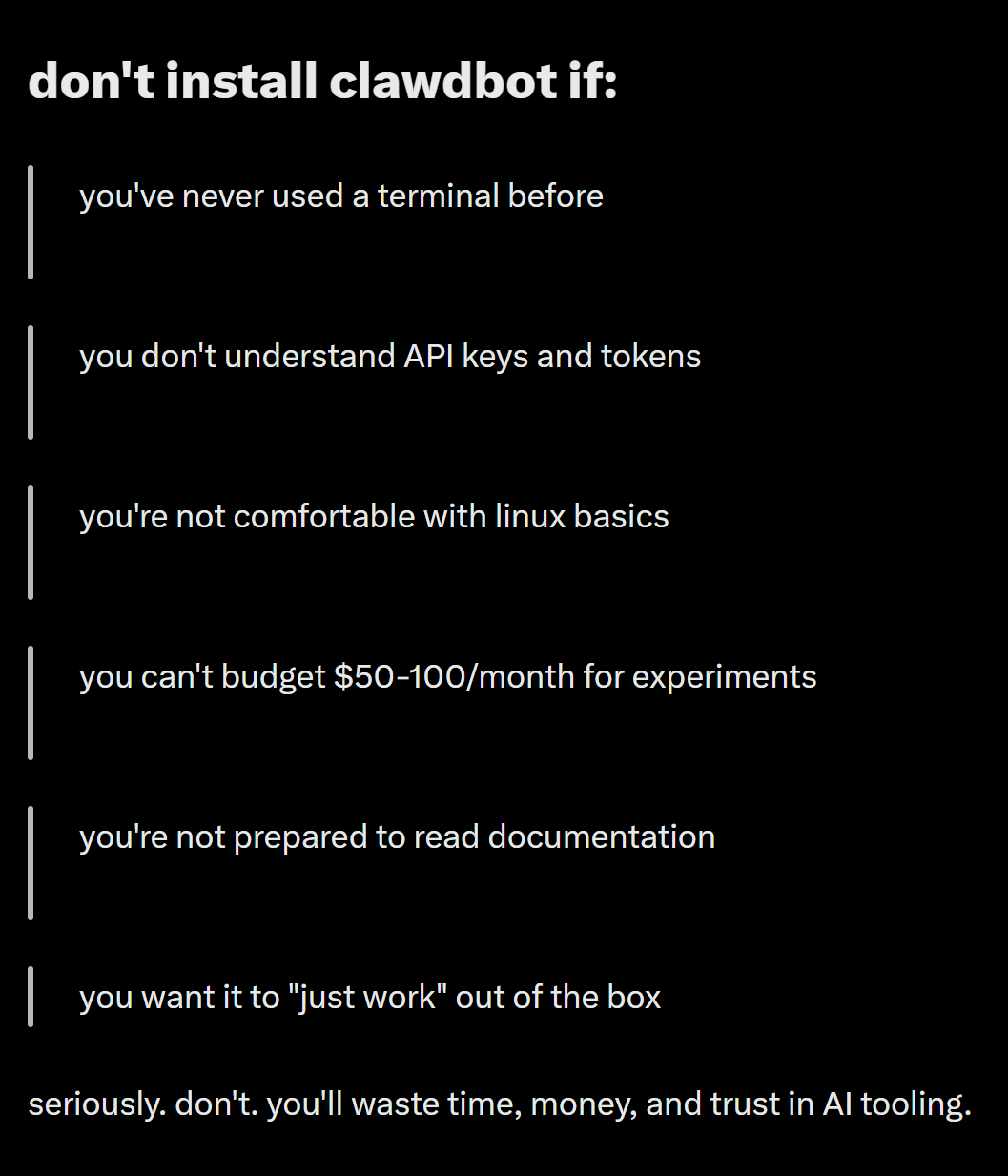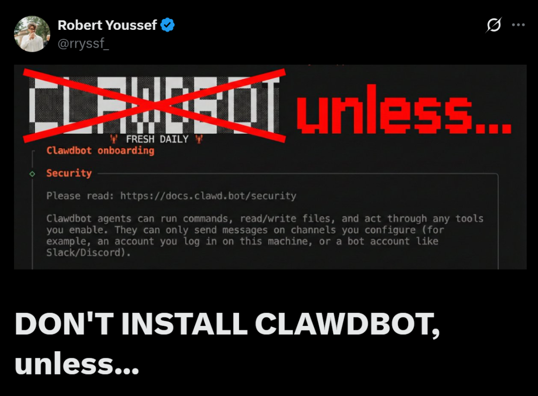Godofprompt公司的联创Robert Youssef,则写下这样一篇劝退长文《除非……否则不要安装ClawdBot!》,内容如下。