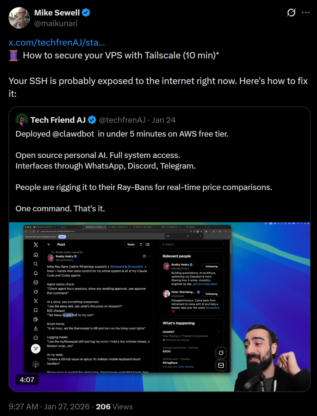 ShineOn的CEO Michael Crist,也分享出一篇文章,介绍自己如何用一个下午,就加固了ClawdBot安全。