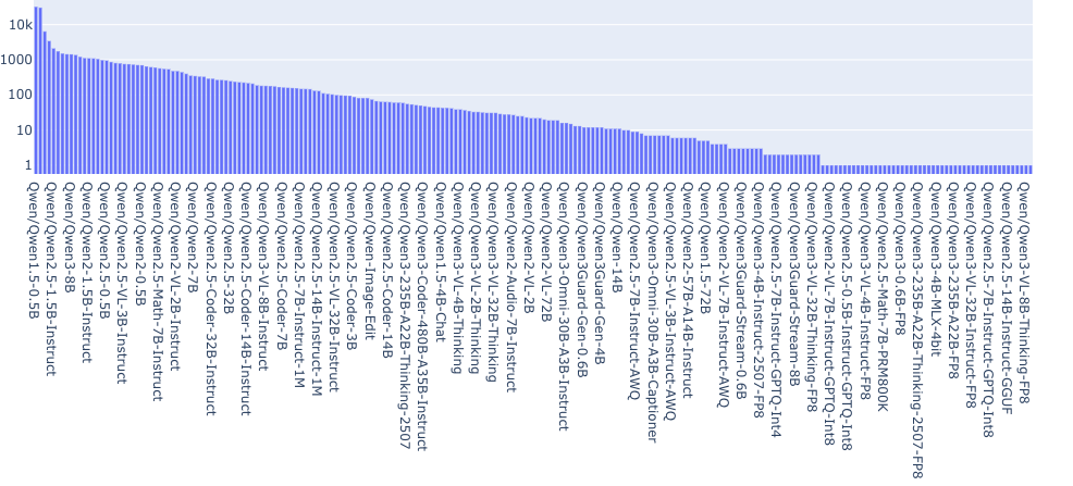 参数规模在 5 亿到 300 亿之间的模型更容易在本地运行、进行微调,并集成到业务系统和智能体工作流中。例如,在 Qwen 系列中,Qwen 1.5-0.5B 拥有最多的衍生模型(见下图)。在算力受限或合规要求严格的环境中,这类模型显然更适合长期运行。与此同时,领先机构通常会使用参数规模在 100B 到 700B 之间的大型 MoE 模型作为能力上限或“教师模型”,再将其能力蒸馏到众多小模型中。这形成了一种清晰的结构:顶层是少数超大模型,下层则是大量实用模型。月度统计中小模型占比的上升,反映了社区中的真实使用需求。