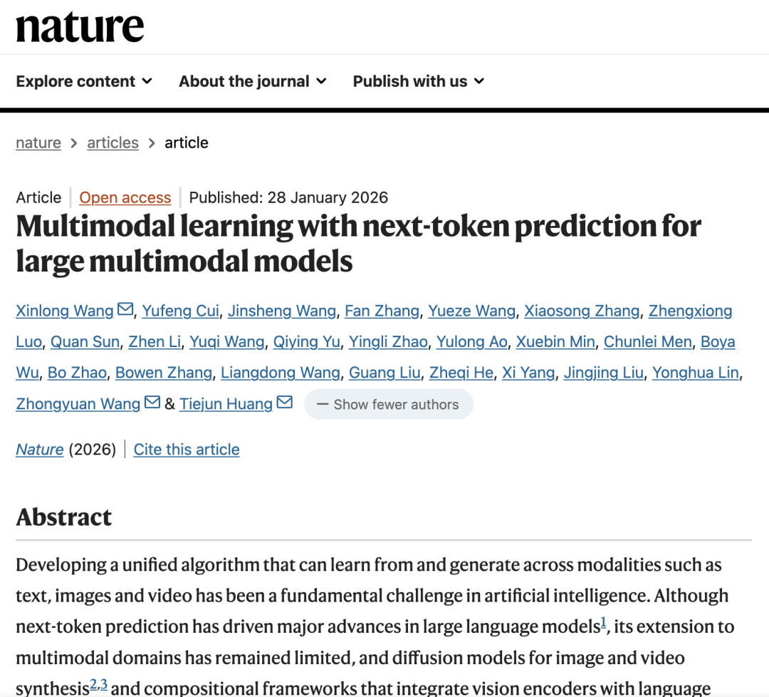 2026年1月28日,智源多模态大模型成果"Multimodal learning with next-token prediction for large multimodal models(通过预测下一个词元进行多模态学习的多模态大模型)"上线国际顶级学术期刊Nature,预计2月12日纸质版正式刊发,这是我国科研机构主导的大模型成果首次在Nature正刊发表。