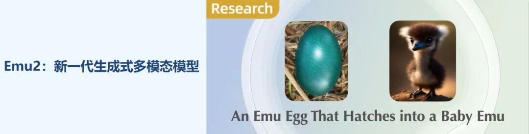 2023年12月,发布Emu2,通过大规模自回归生成式多模态预训练,展现出可泛化的多模态上下文学习能力,可在少量示例和简单指令下完成听、说、读、写、画等任务,是当时开源最大的生成式多模态模型。
