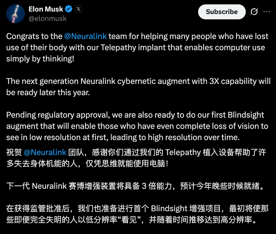 下一代Neuralink「赛博增强装置」将实现3倍性能提升。