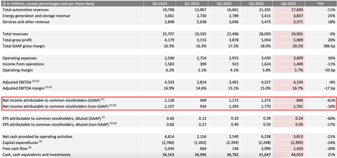 财报显示,特斯拉第四季度净利润为8.40亿美元,较上年同期下降了61%。