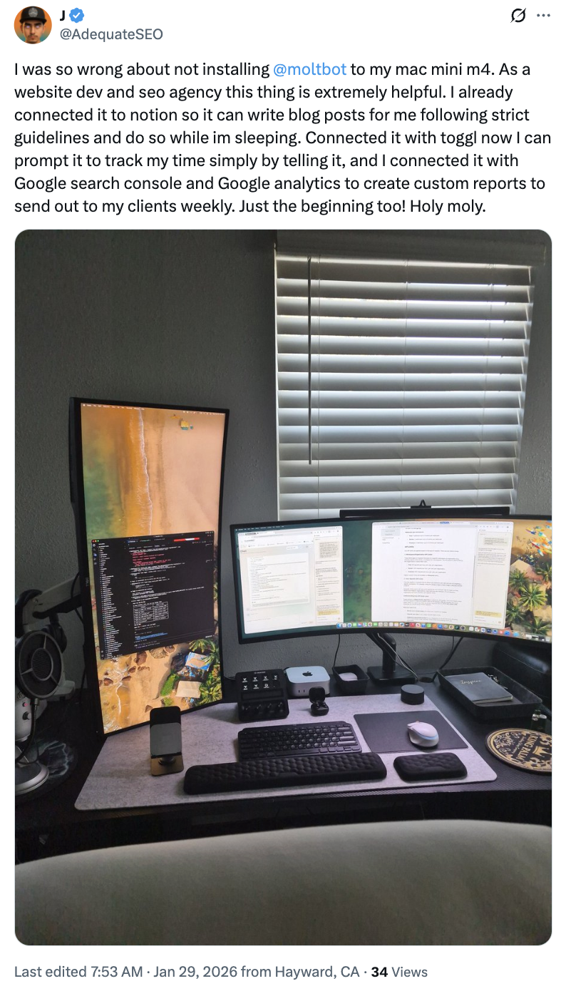 Moltbot的实用价值被开发者们挖掘得淋漓尽致。有网站开发兼SEO领域的从业者直呼“我恨早前没给Mac Mini安Moltbot”。