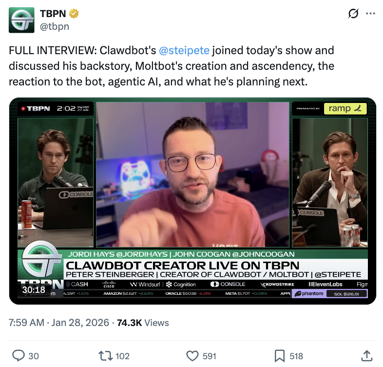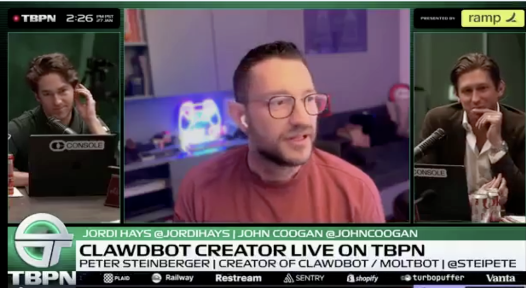Peter最新参加了TBPN平台的直播访谈节目,回答了网友们感兴趣的一系列问题,包括Clawdbot项目起源、开发动机、发展历程、更名过程、行业影响、应用前景、安全挑战等。