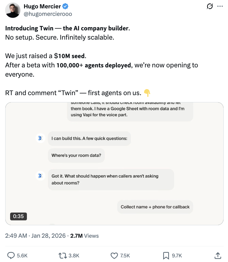 比如下面这个一站式AI业务搭建工具“𝗧𝘄𝗶𝗻”,号称零配置部署、安全原生、无限弹性扩容,其主打的核心能力是能兼容各类app、支持浏览器操控、可自主做出决策、具备长期记忆能力。