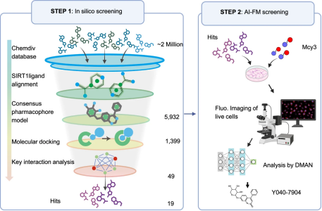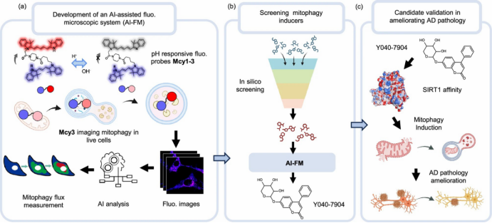 团队构建了 AI-FM 系统,将 pH 响应型线粒体探针与深度学习结合,实现线粒体自噬通量及中间体的动态可视化与定量分析。基于该平台筛选得到 SIRT1 激动剂 Y040-7904,揭示其通过 SIRT1/FoxO3 通路增强线粒体自噬,并在 AD 模型中减轻 Aβ 相关病理,展现潜在治疗价值。