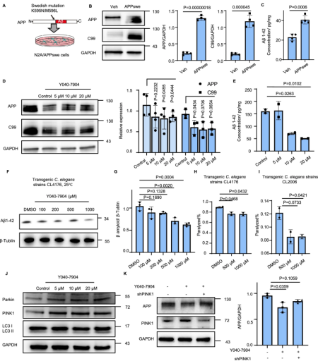 ● 细胞模型验证:在 APPswe 过表达的 N2a 细胞中(APP/C99/Aβ 过量且线粒体自噬相关蛋白下调),Y040-7904 可显著降低 APP 和 C99 水平,并剂量依赖性减少 Aβ1-42,提示其具有缓解淀粉样病理的潜力。