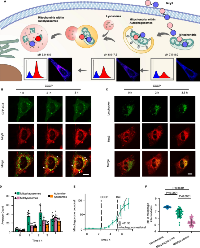 随后,研究团队利用 pH 响应探针 Mcy3,对 CCCP 诱导的线粒体自噬过程进行了实时监测。通过与 GFP-LC3 和 LysoTracker 共成像,证实了线粒体依次与自噬体和自噬溶酶体融合,并伴随线粒体 pH 从中性逐步下降至酸性。定量分析表明,CCCP 处理显著提高了线粒体自噬中间体数量和自噬通量,且线粒体形态由管状向点状转变。不同中间体呈现连续的 pH 梯度变化,证明 Mcy3 能够有效反映线粒体自噬通量及其动态中间体特征。
