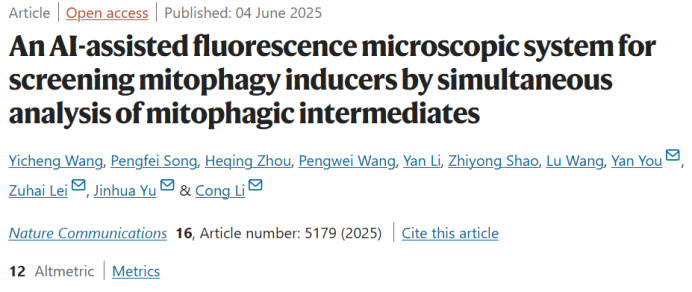 今天为大家介绍一篇2025年6月发表在《Nature Communications》的文章,题目是“An AI-assisted fluorescence microscopic system for screening mitophagy inducers by simultaneous analysis of mitophagic intermediates”。复旦大学李聪、余锦华、云南大学药学院雷祖海、复旦大学游艳为本篇文章的共同通讯作者。